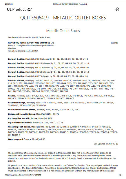 মান:UL CERTIFICATE সংখ্যা:E489690 প্রদানের তারিখ:2017-01-03 মেয়াদ শেষ হওয়ার তারিখ:2027-01-02 ব্যাপ্তি / বিন্যাস:hardware of support of conduit, Tube and cable প্রদান করেছেন:UL LLC |